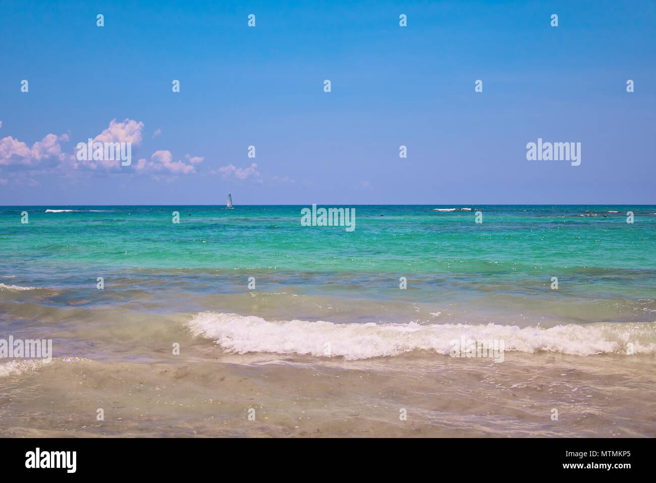 Vista Della Spiaggia Tropicale I Turisti Di Marcia Parasailing Barca Con Paracadute Yacht A Vela Vele Sulle Onde Acque Turchesi Del Mar Dei Caraibi Riviera Maya Messico Foto Stock Alamy