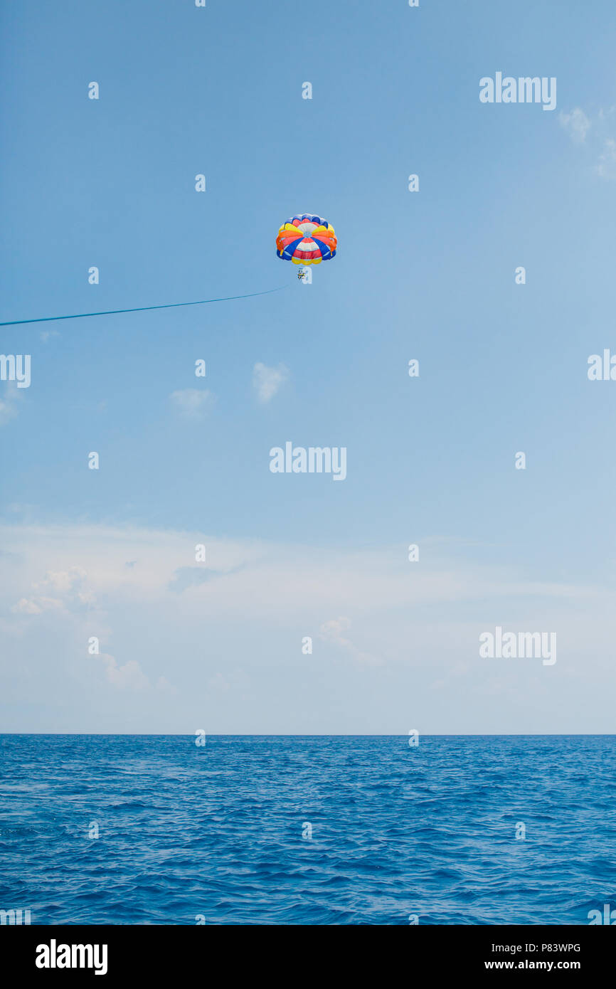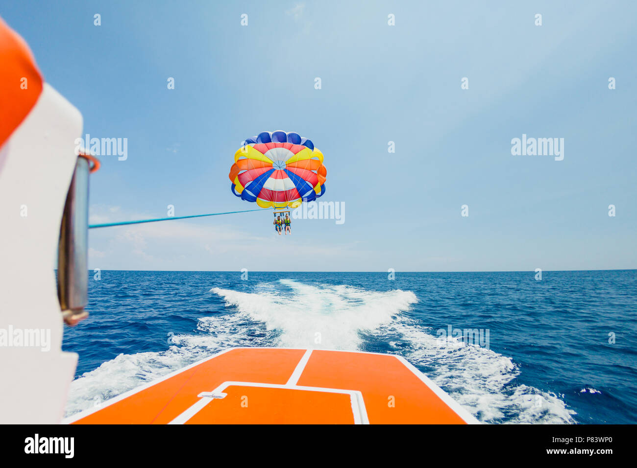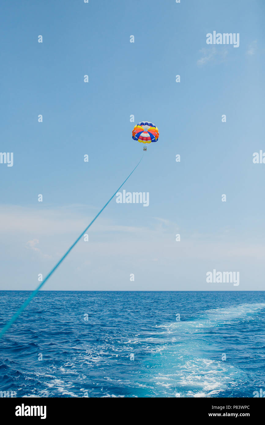 Spettacolare Vista Panoramica Sul Mare E Cielo Blu Con Persone A Volare Su Un Coloratissimo Paracadute Trainato Da Una Barca A Motore Foto Stock Alamy