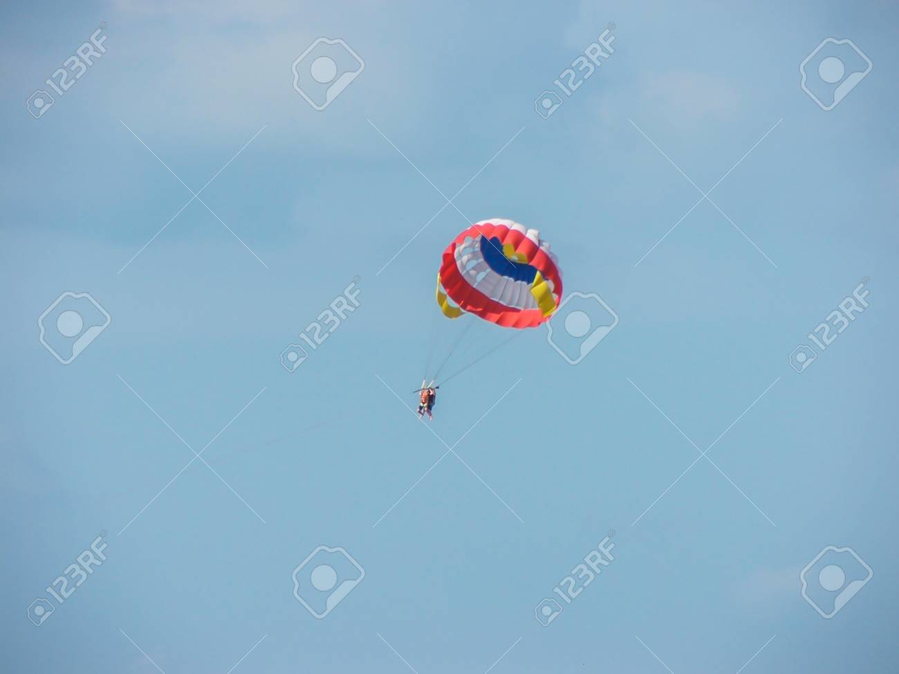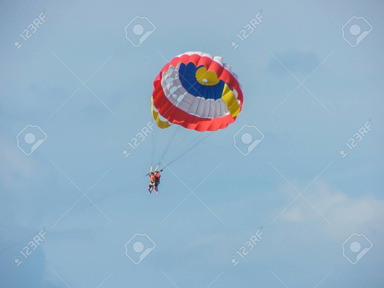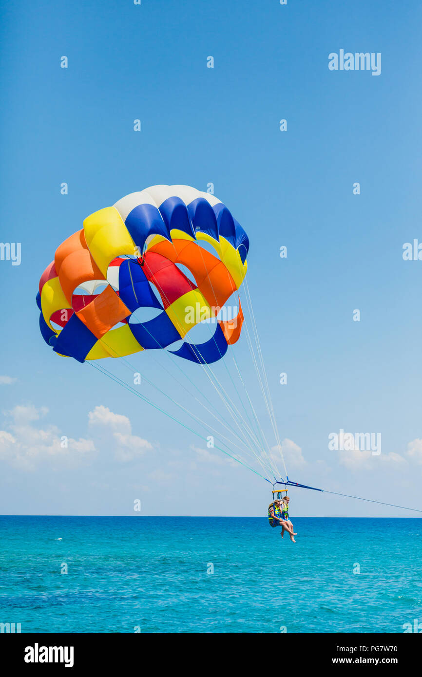 Spettacolare Vista Panoramica Sul Mare E Cielo Blu Con Persone A Volare Su Un Coloratissimo Paracadute Trainato Da Una Barca A Motore Foto Stock Alamy