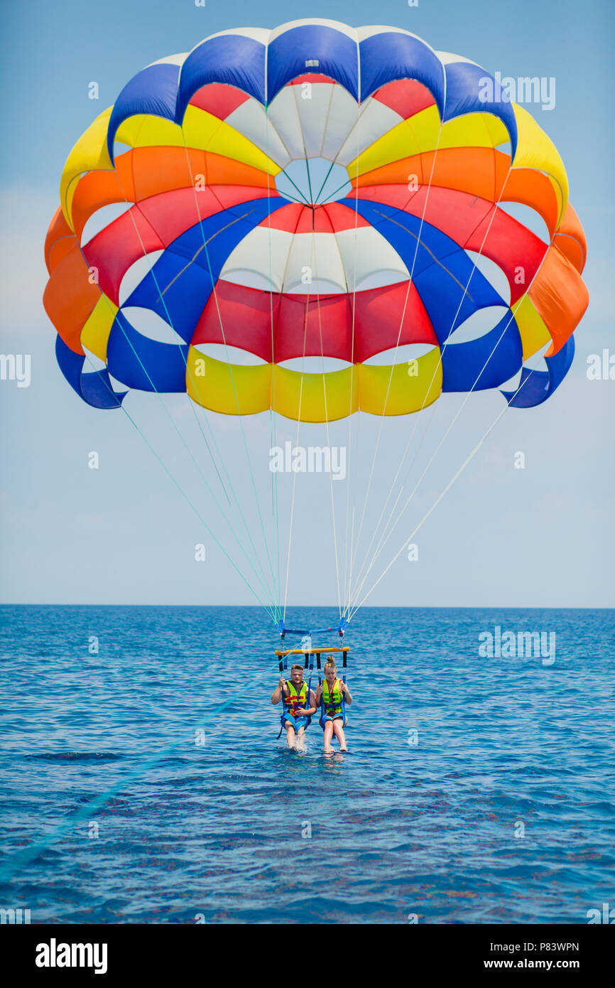Il Parasailing Acqua Divertimento Volare Su Un Paracadute Dietro Una Barca Su Un Vacanza Estiva Al Mare Nel Resort Foto Stock Alamy