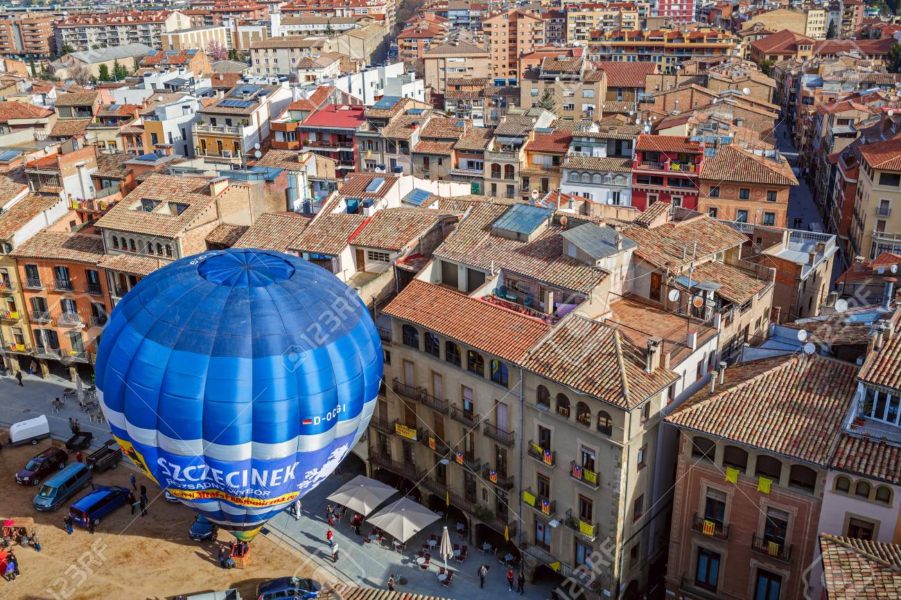 Immagini Stock Vic Spagna 27 Marzo 15 Lancio Della Mongolfiera Sulla Piazza Principale Della Citta Spagnola Storica Di Vic Spagna Provincia Di Barcellona Image