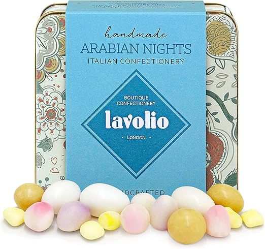 Lavolio Arabian Nights Confetti In Scatola Di Latta Confezione Regalo 175g Selezione Di Alta Qualita Di Mandorle Ricoperte Fiori Di Gelatina E Cioccolato Ispirati Ai Turkish Delights Tipiche Delizie Turche Amazon It