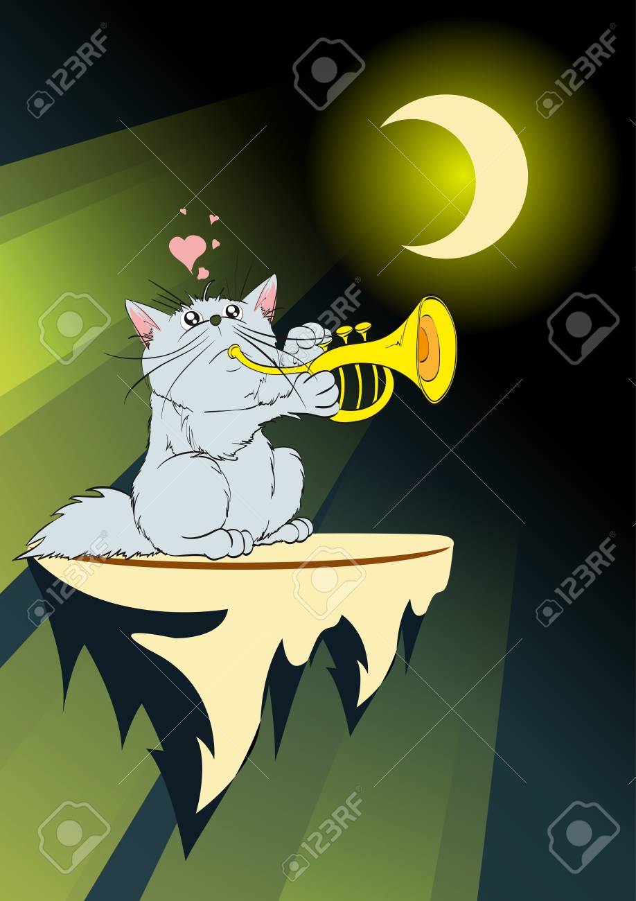 Vettoriale Un Simpatico Gatto Innamorato Suona Una Tromba Al Chiaro Di Luna Biglietto Di Auguri Di Primavera Image