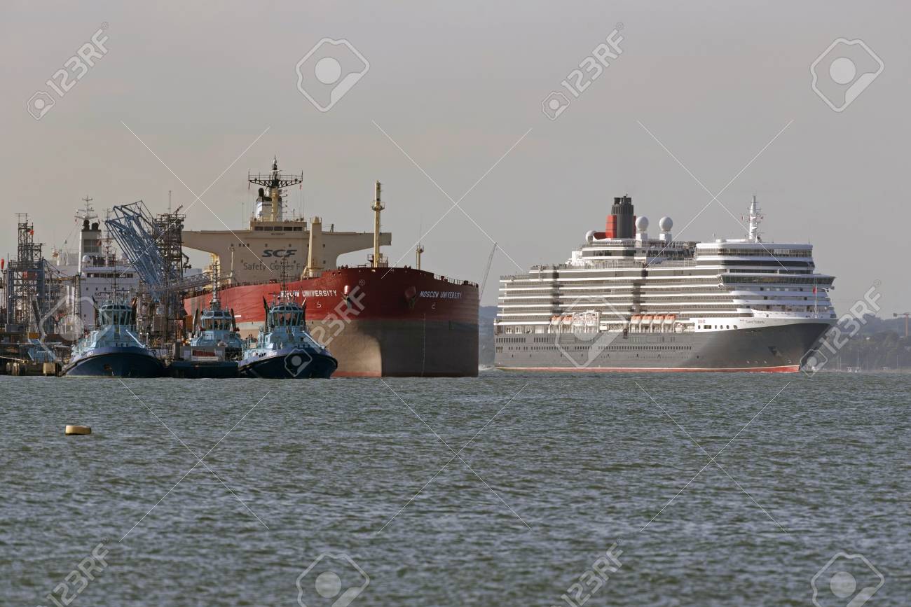 Immagini Stock Nave Da Crociera Queen Elizabeth Che Passa La Nave Cisterna Russa Universita Di Mosca A Fianco Del Fawley Marine Terminal Di Southampton Water Inghilterra Regno Unito Agosto 17 Image