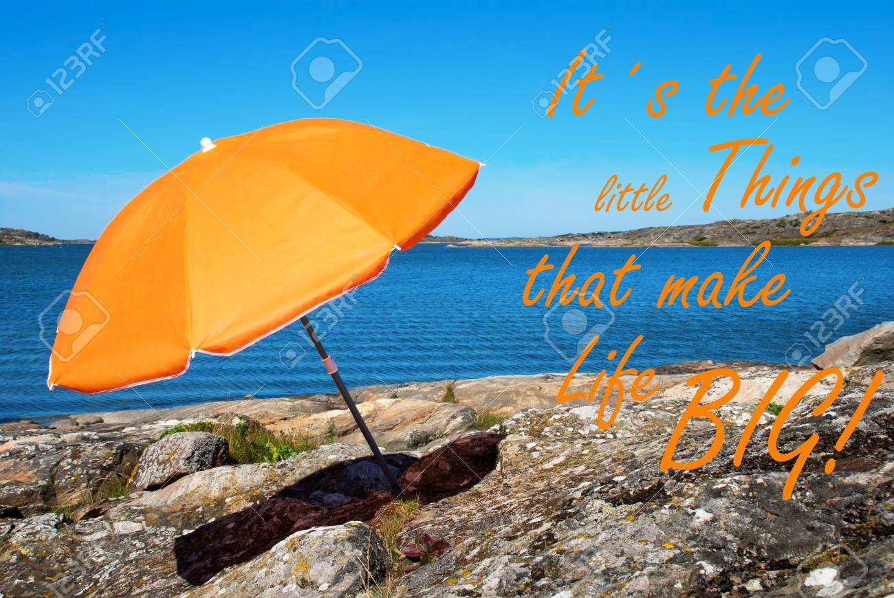 Immagini Stock Bohuslan Goteborg Svedese West Coast E Spiaggia Con Orange Ombrellone E Inglese Vita Quote Che Sono Le Piccole Cose Che Rendono La Vita Big Con Oceano E Open Sea