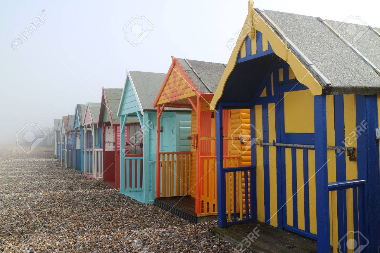 Immagini Stock Colorful Spiaggia Capanne In Inglese Citta Di Mare Nella Nebbia Image