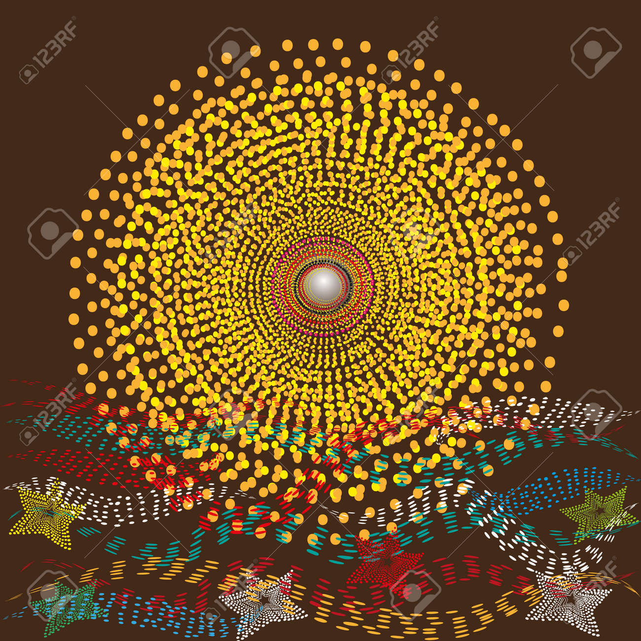 Dibujo Puesta De Sol En El Mar De Dibujo Sobre Un Fondo Marron Puesta De Sol En El Mar Se Dibuja En El Estilo De Sol Amarillo Puantizm Olas De Estrellas Navales