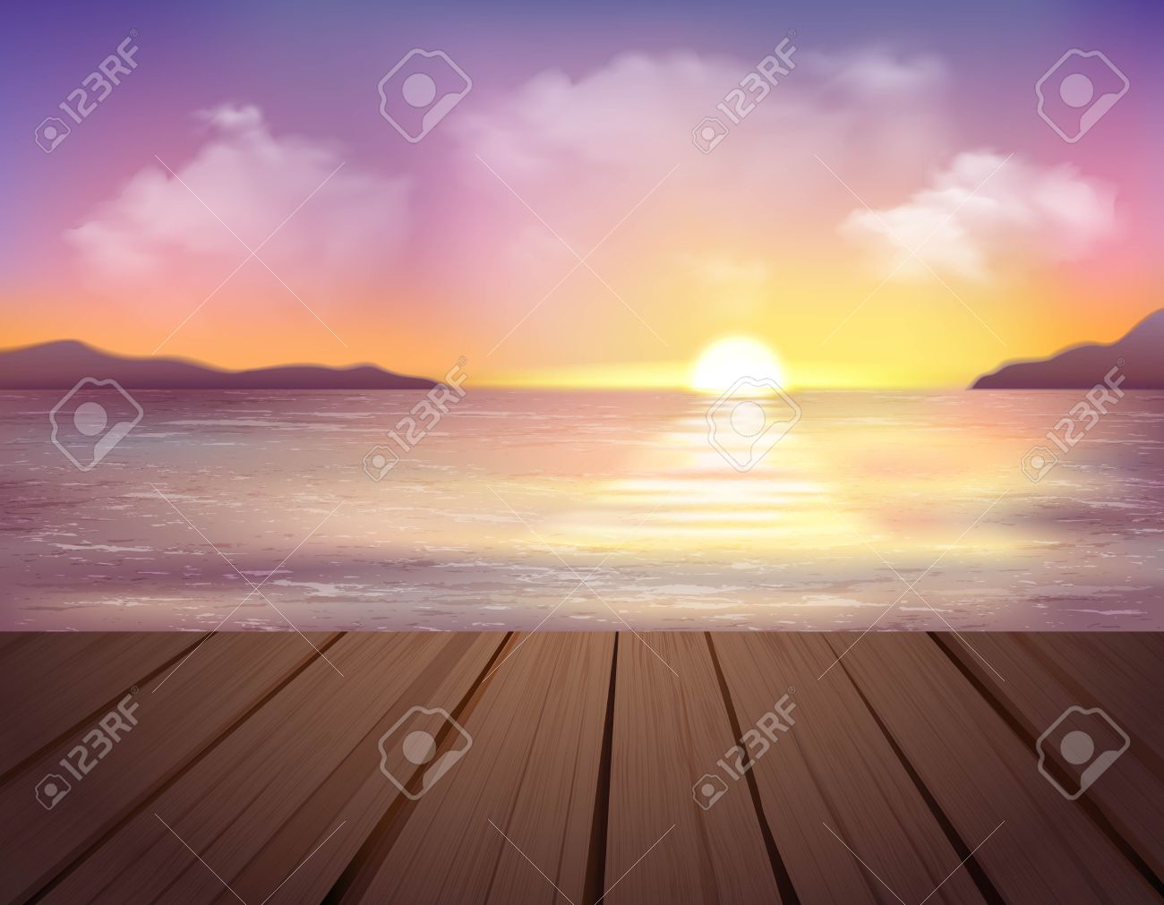 Paisaje Con Montanas Al Mar Muelle Y La Puesta Del Sol En El Cielo De Colores Con La Ilustracion Vectorial De Dibujos Animados Nubes Ilustraciones Vectoriales Clip Art Vectorizado Libre De Derechos