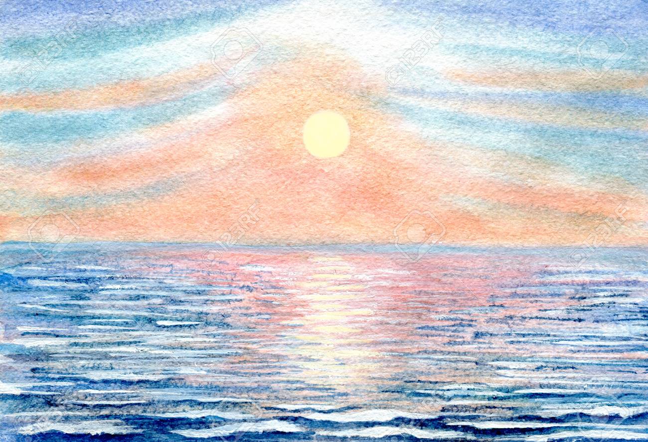 Paisaje Marino Puesta De Sol En El Mar Cielo Nublado Y Reflejo En El Agua Ilustracion De Acuarela Pintada A Mano Y Textura De Papel Fotos Retratos Imagenes Y Fotografia De Archivo