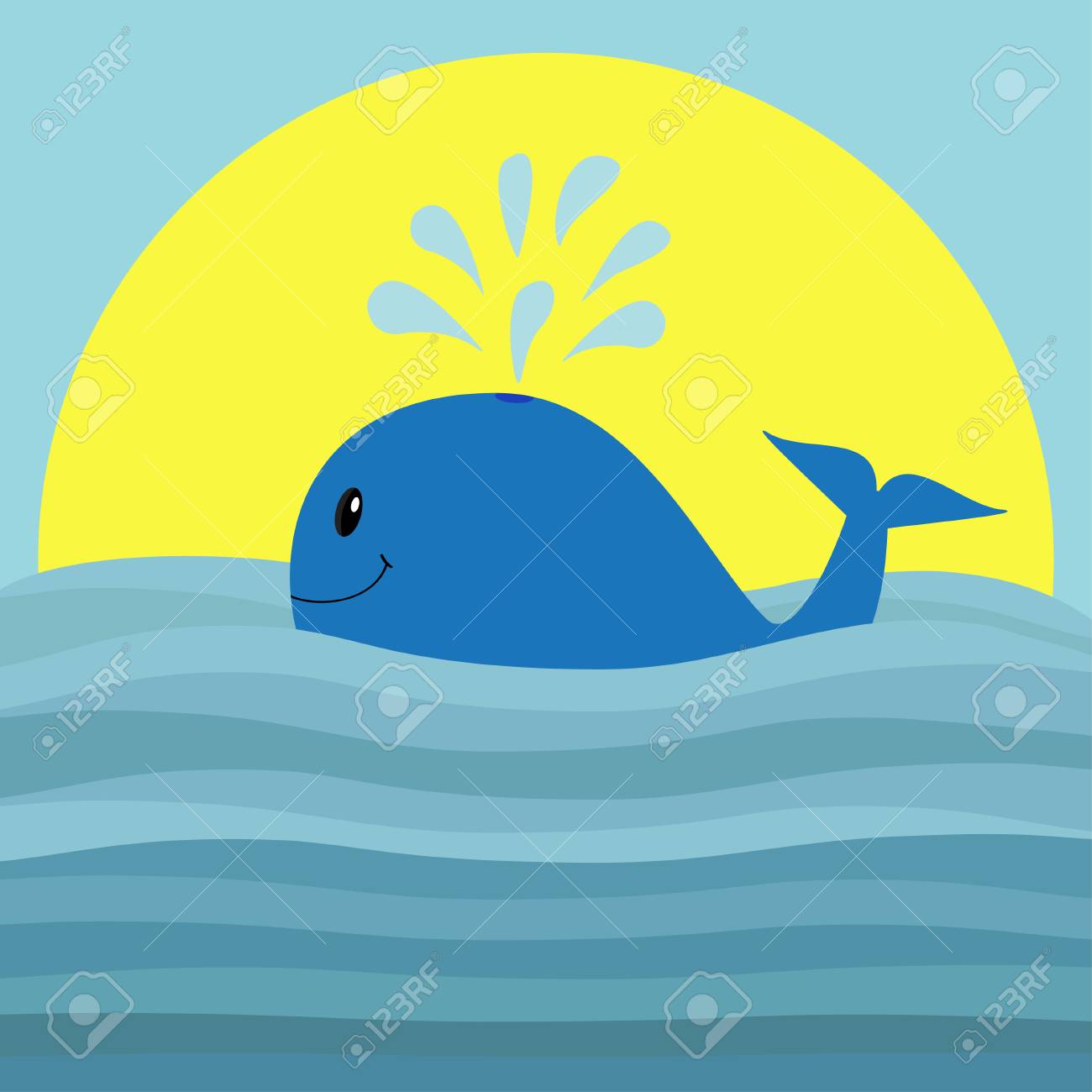 Ballena Con Fuente De Agua Ola Oceanica Del Mar Puesta De Sol Personaje De Dibujos Animados Lindo Con Ojos Aleta Caudal Cara Sonriente Coleccion De Animales De Bebe Para Ninos Diseno Plano