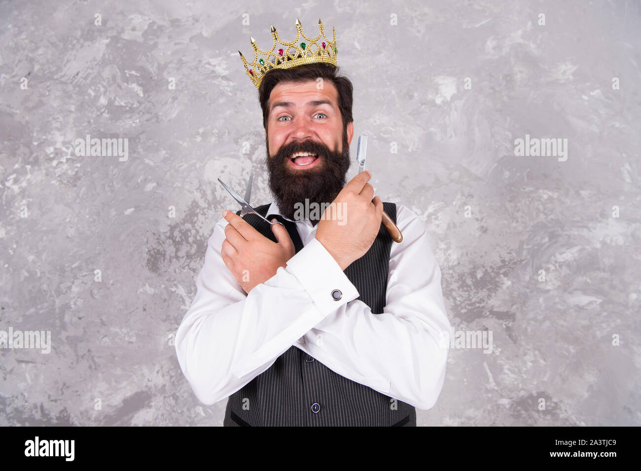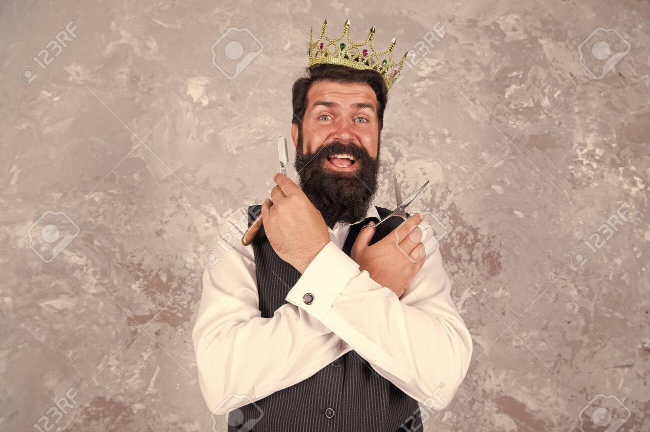 Oh My Gosh Barber With Surprised Bearded Face Bearded Big Boss Wear Crown Bearded Man Hold Scissors And Razor Barber Tools Luxury Barbershop Trendy Hairstyle For Bearded Hipster Stock Photo Alamy