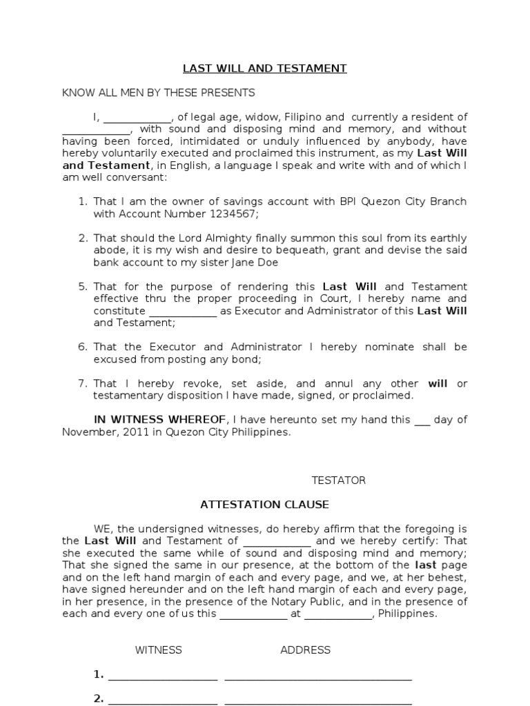 A last will and testament refers to an act whereby an individual is permitted, following the legal procedures, to control a certain degree the disposition of his/her estate The will serves as a document whereby the testator disposes of his/her estate or property, which will take effect upon his/her death. Since your fatherinlaw’s last will involves the presence of witnesses and the act of notarization, it is safe to say that his last will is in the form of an attested will Considering this, we shall refer to specific provisions of the Civil Code of the Philippines, which lay out the manner by which attested wills are executed, to wit. I, name of testator, Filipino citizen, of legal age, single/married to name of spouse if any, born on the date, a resident of address, being of sound and disposing mind and memory, and not acting under undue influence or intimidation from anyone, do hereby declare and proclaim this instrument to be my Last Will and Testament, in English, the language which I am well conversant And I hereby declare that.