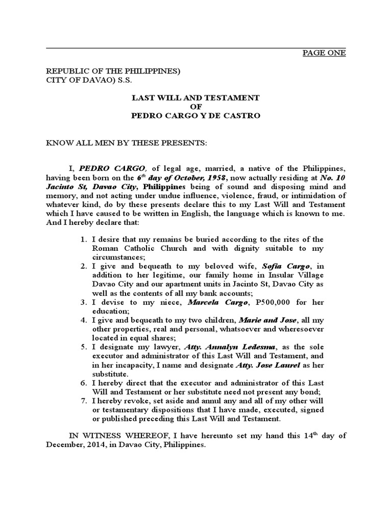 Civil code of the philippines last will and testament December 30, Published by. LONCION, Madelone C SUCCESSION Law 3 Assignment PAGE ONE REPUBLIC OF THE PHILIPPINES) CITY OF CAGAYAN DE ORO) SS LAST WILL AND TESTAMENT Of Amelia Mayonette Corpuz Renaldi KNOW ALL MEN BY THESE PRESENTS I, Amelia Mayonette Corpuz Renaldi, of legal age, single, a native of Philippines, having been born on the 6 th day of October, 1958, now actually residing at Door #143, 44 th Street. My wife’s parents passed away few years back and wala po iniwan na last willing testament para sa mga anak nila, 6 po silang magkakapatid including my wife, yung 5 po they decided na ibenta sa aming mag asawa yung.