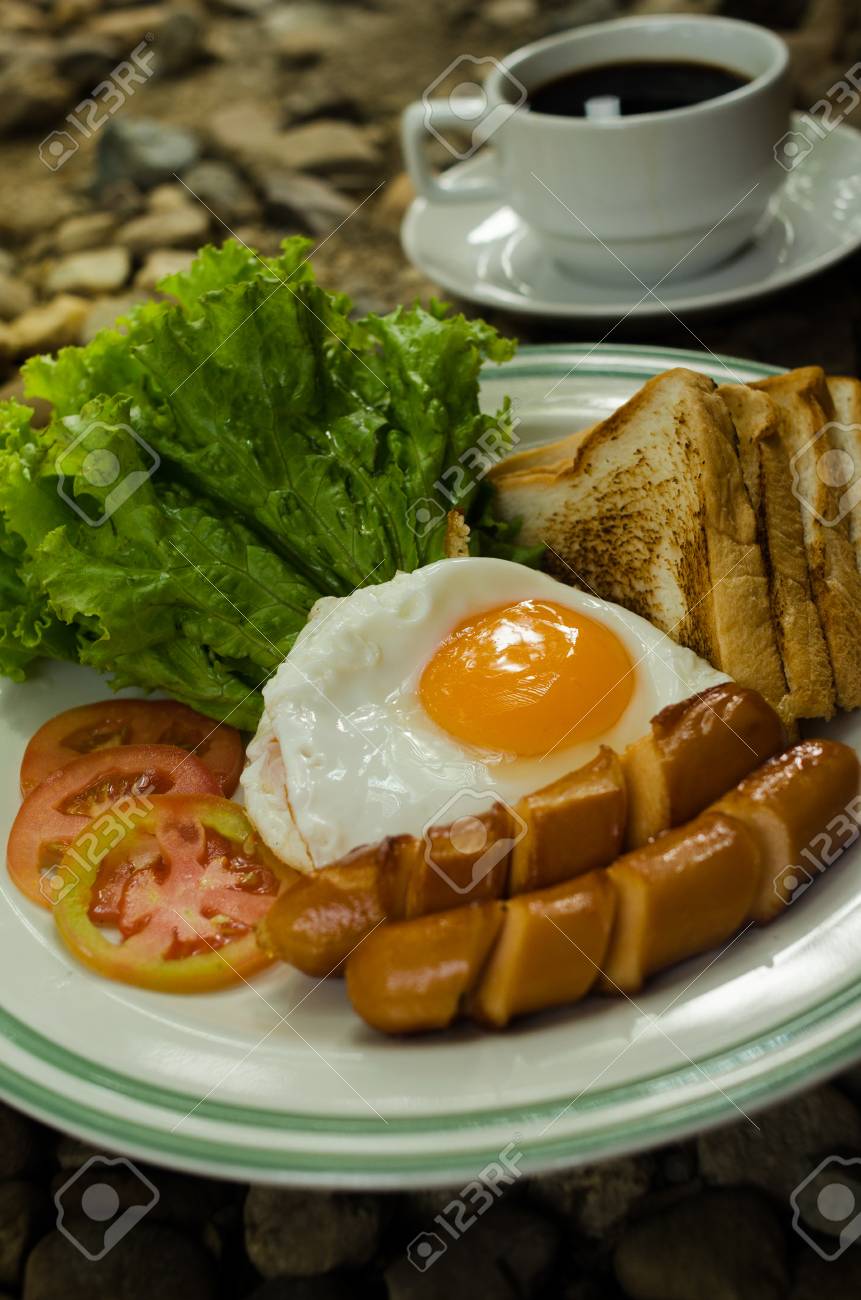Immagini Stock Colazione All Inglese Con Uova Fritte Salsicce Toast Insalate Fresche E Caffe Caldo O Te Image