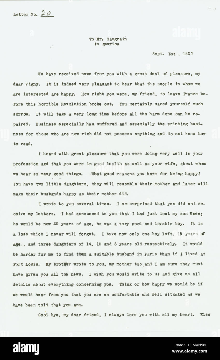 Per Quanto Riguarda La Famiglia E Parigi Titolo Digitata La Traduzione Della Lettera Da Plassan Antoine Saugrain 1 Settembre 1802 1 Settembre 1802 Plassan A Foto Stock Alamy