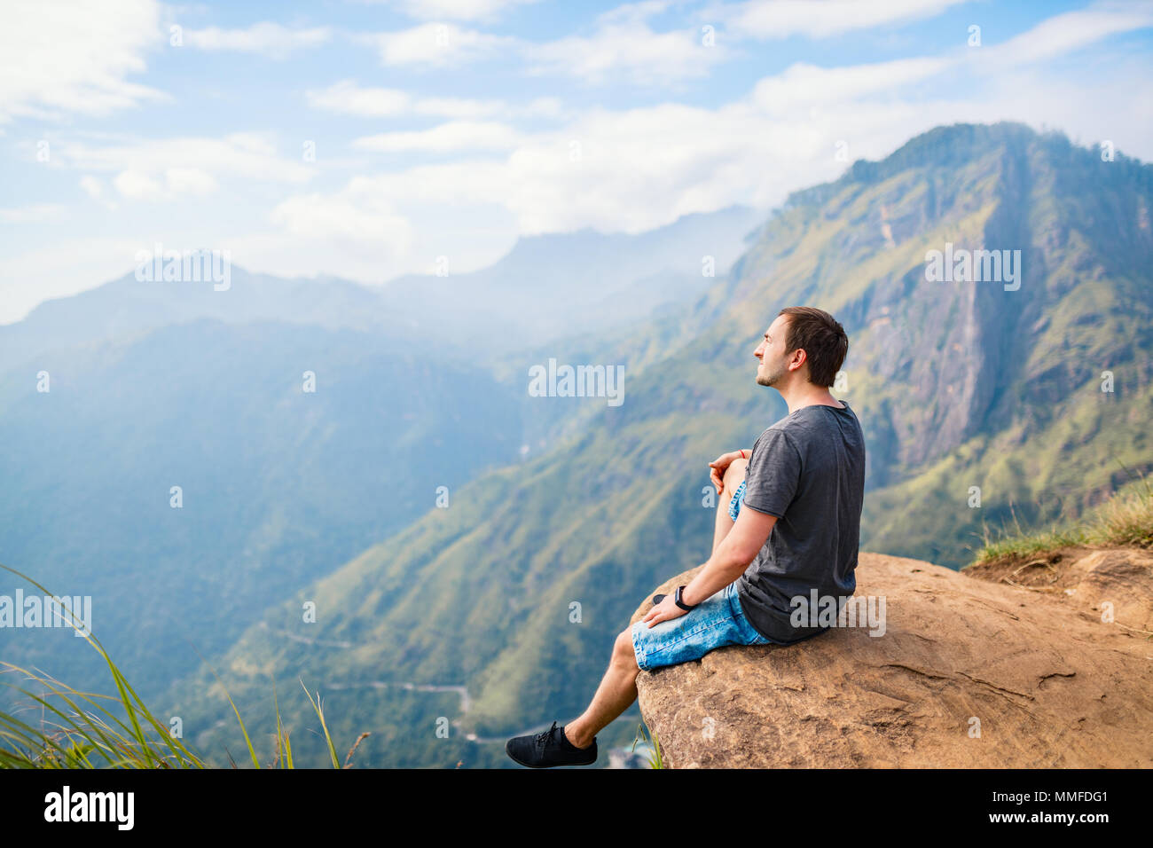 Giovane Uomo Godendo Di Panorami Mozzafiato Sulle Montagne E Le Piantagioni Di Te Da Poco Adams Picco In Ella Lo Sri Lanka Foto Stock Alamy