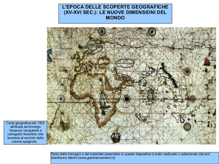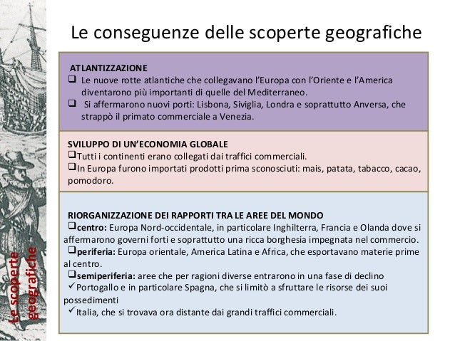 Sep 28, 13Lescoperte geografiche Le conseguenze delle scoperte geografiche ATLANTIZZAZIONE Le nuove rotte atlantiche che collegavano l’Europa con l’Oriente e l’America diventarono più. Le scoperte geografiche rivoluzionarono il mondo Occidentale portando a un periodo di messa in discussione delle certezze e di rinnovamento Le notizie riportate dai navigatori su nuovi territori inesplorati, i contatti con civiltà. The Concept Map you are trying to access has information related to scoperte geografiche, ricerca di nuove rotte marittime per raggiungere le Indie orientali tramite strumenti di navigazione nuovi o perfezionati, scoperta dell'America conseguenze diffusione di nuovi alimenti e di nuove malattie, circumnavigazione dell'Africa e scoperta dell'Africa nera conseguenze facile incetta di oro.