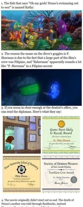 1 The fish That Says Oh My Gosh Nemo S Swimming Out To Sea Is Named Kathy 2 The Reason The Name On The Diver S Goggles Is P Sherman Is Due To The