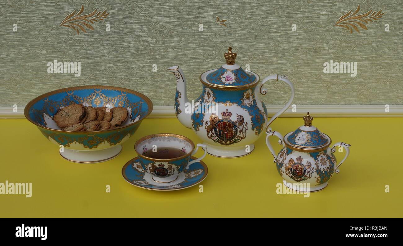 Inglese Tazzina Con Piattino Teiera Zuccheriera E Una Torta Ciotola Con I Cookie Raffinato Osso Di Cina La Porcellana Foto Stock Alamy