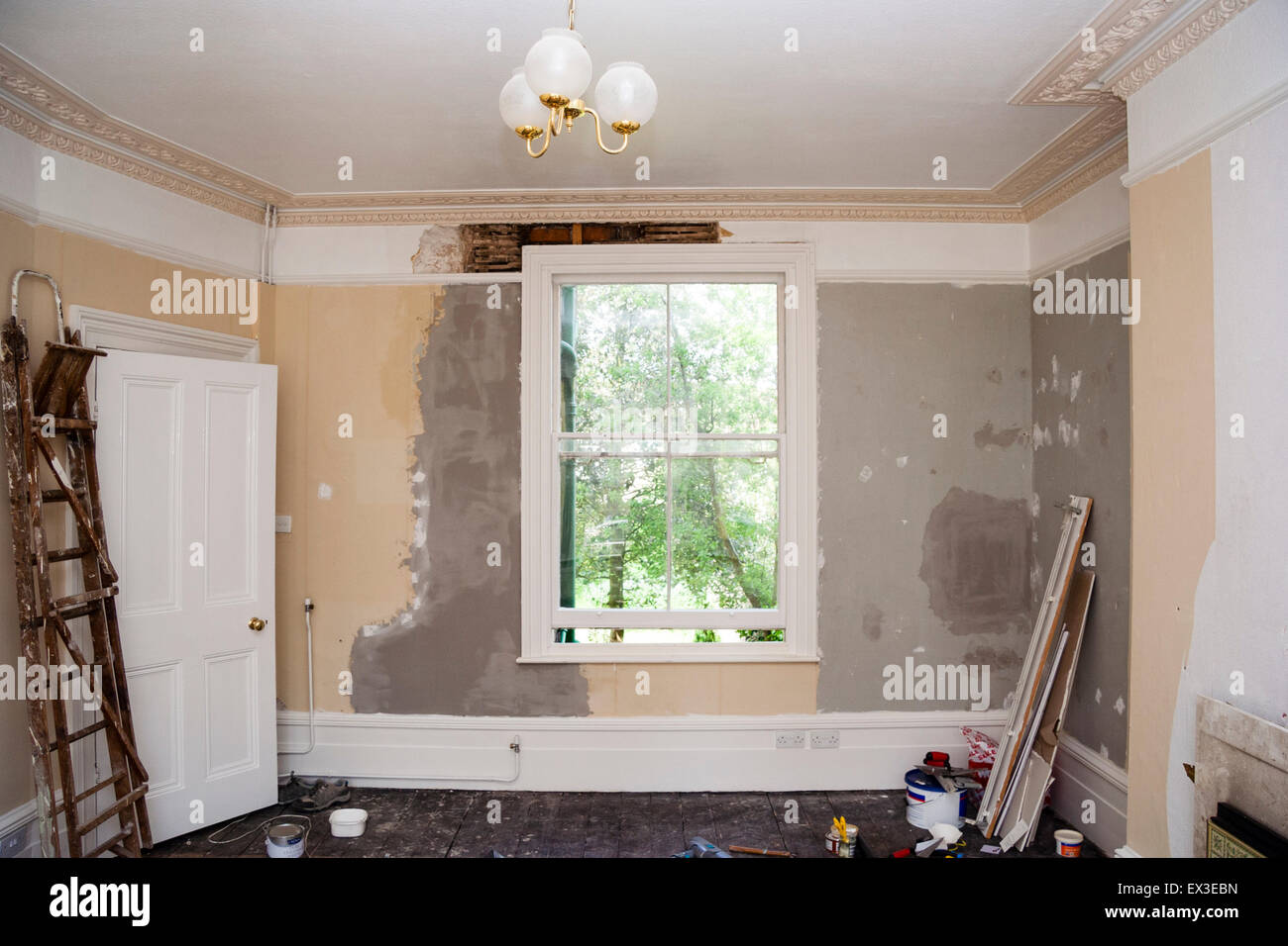 Grande Sala Interna Con Finestra In Un Inglese Victorian House Mentre Sono Sottoposti Al Fai Da Te La Decorazione O La Ristrutturazione Diversi Ausili E Strumenti Che Stabilisce Intorno A Foto Stock
