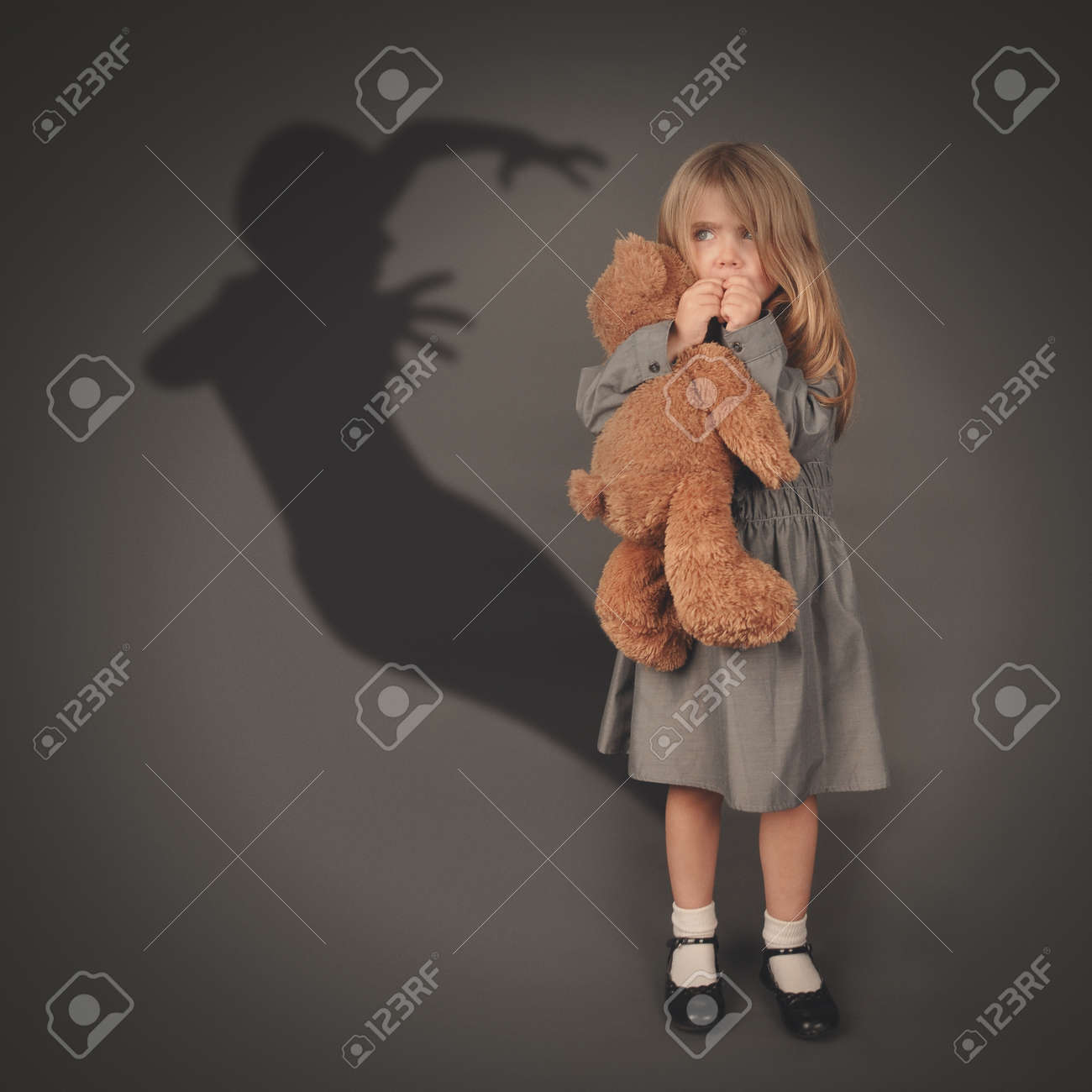 Immagini Stock Una Bambina E In Possesso Di Un Orsacchiotto E Guardando Un Pauroso Sagoma Scura Di Un Fantasma Maligno Saltar Fuori Su Uno Sfondo Grigio Image