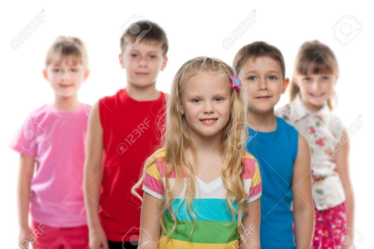 Immagini Stock Una Bambina Si Trova Di Fronte A Un Gruppo Di Bambini Il Focus E Sulla Ragazza Isolato Su Sfondo Bianco Image