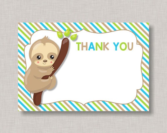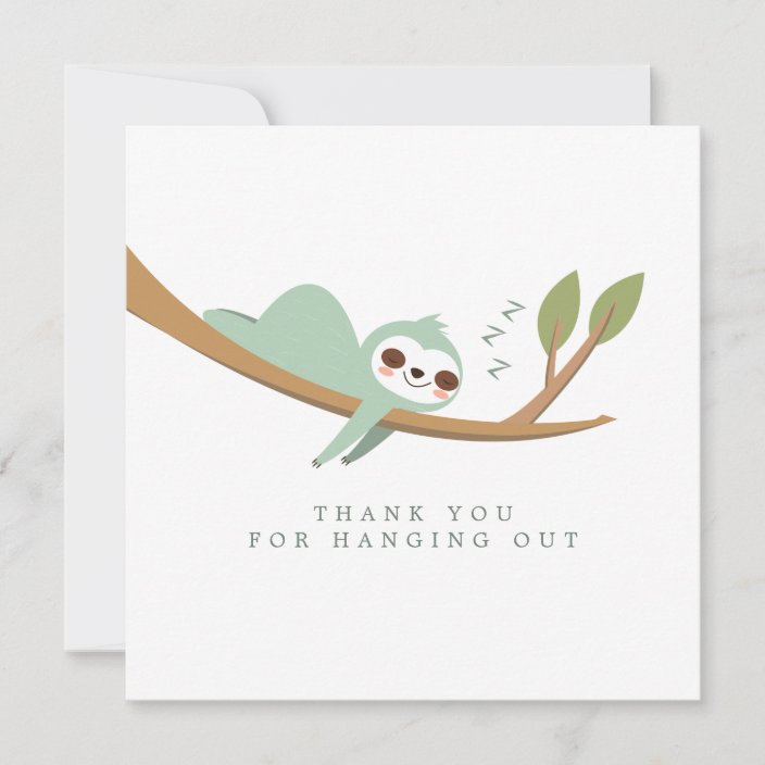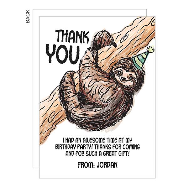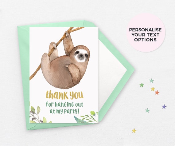 Some features of our Sloth Thank You Cards for Kids Adorable sloth hanging out to say thanks so they match our Sloth party supplies Professionally printed on 80# cardstock paper so you feel the quality Teaches children how to send a meaningful hand written note Easy to use because all you have to do is simply fill in and mail out 10 cards and 10 white envelopes included 45 X 55” so they are the perfect size for a quick thank you card. Thank you for the perfect sloth card, as you can see it's right next to my other perfect sloth holiday card from (who I already thanked in another Press J to jump to the feed Press question mark to learn the rest of the keyboard shortcuts. Sloth eCards might not be your first choice of animal eCard to send out, but they can definitely be cute Whether they are parachuting, hanging off a tree, or eating leaves, sloths can be pretty cute.