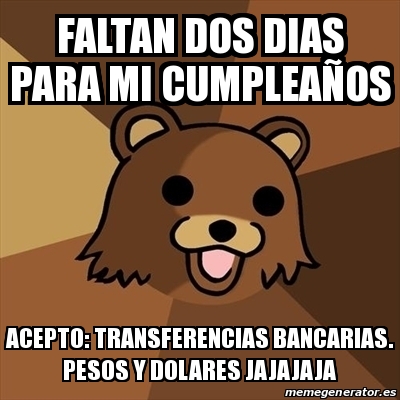 Meme Pedobear Faltan Dos Dias Para Mi Cumpleaa Os Acepto Transferencias Bancarias Pesos Y Dolares Jajajaja