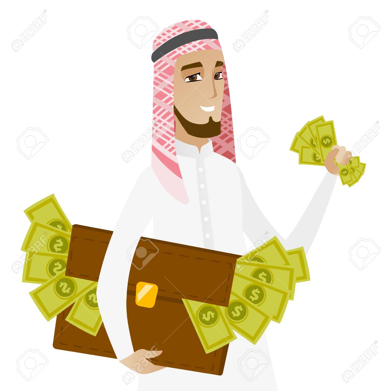 Vettoriale Uomo D Affari Musulmano In Piedi Con Una Valigetta Piena Di Soldi E Commissione Di Criminalita Economica Uomo D Affari Rubare Soldi Concetto Di Crimine Economico Illustrazione Di Disegno Piatto Di Vettore