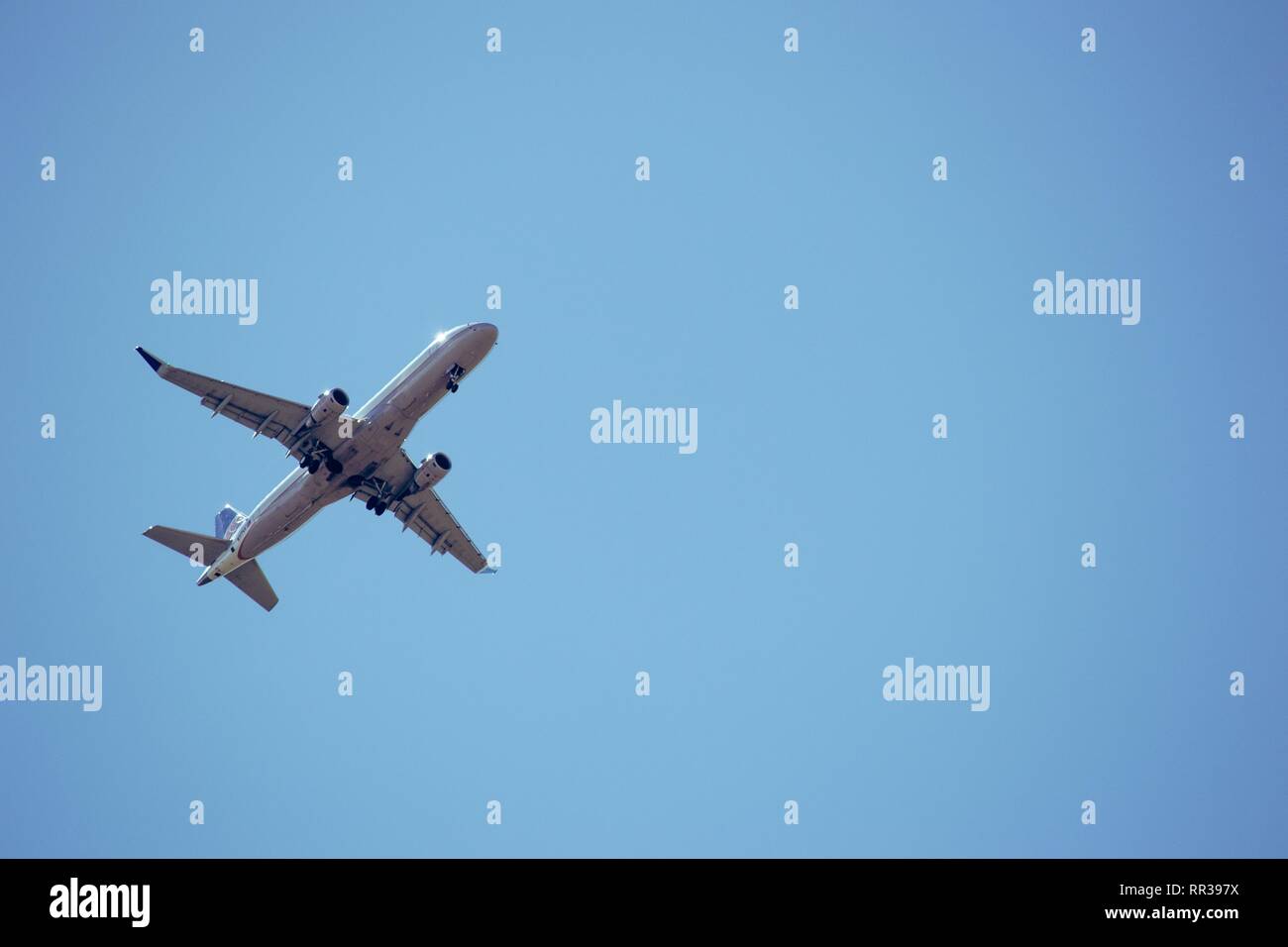 Looking Up At A Plane Flying Over With Blue Clear Sky Stock Photo Alamy