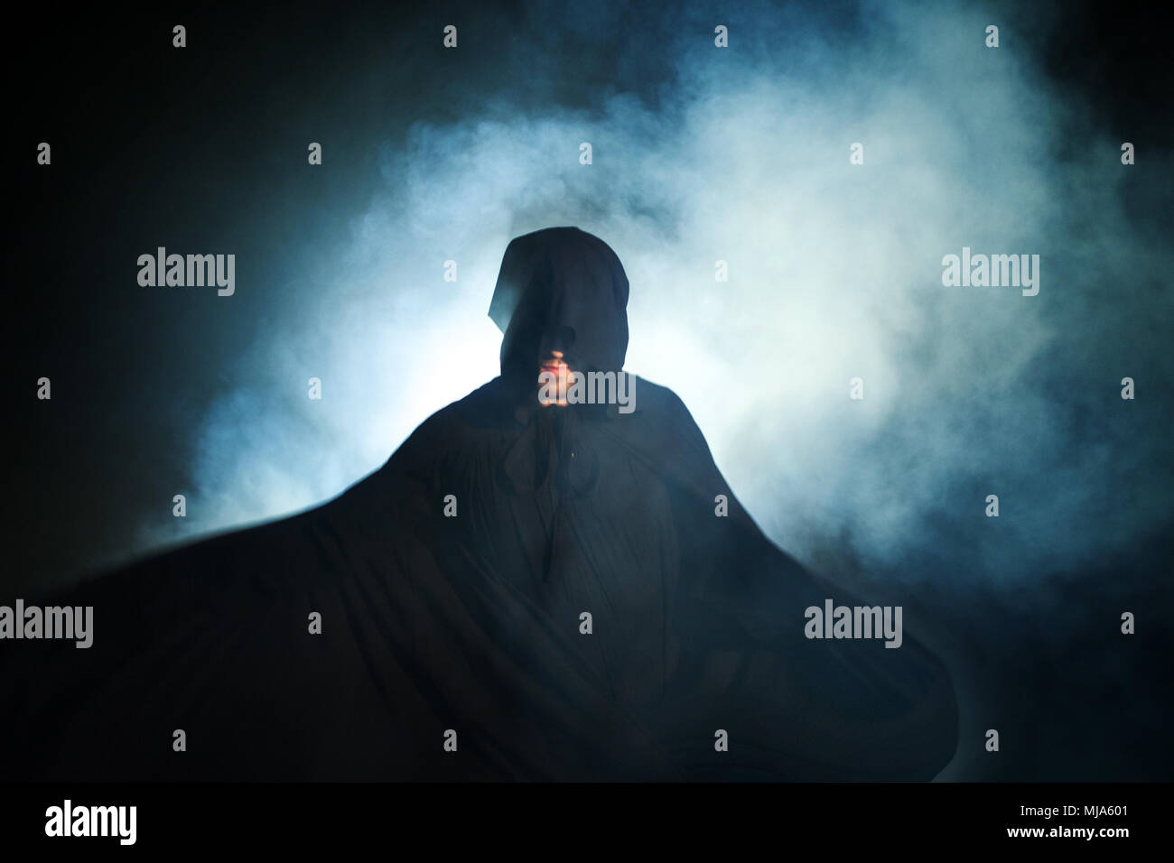 Immagine Cupa Uomo In Un Mantello Nero Immagine Demoniaca Mago Illusionista Sfondo Di Fumo Foto Stock Alamy