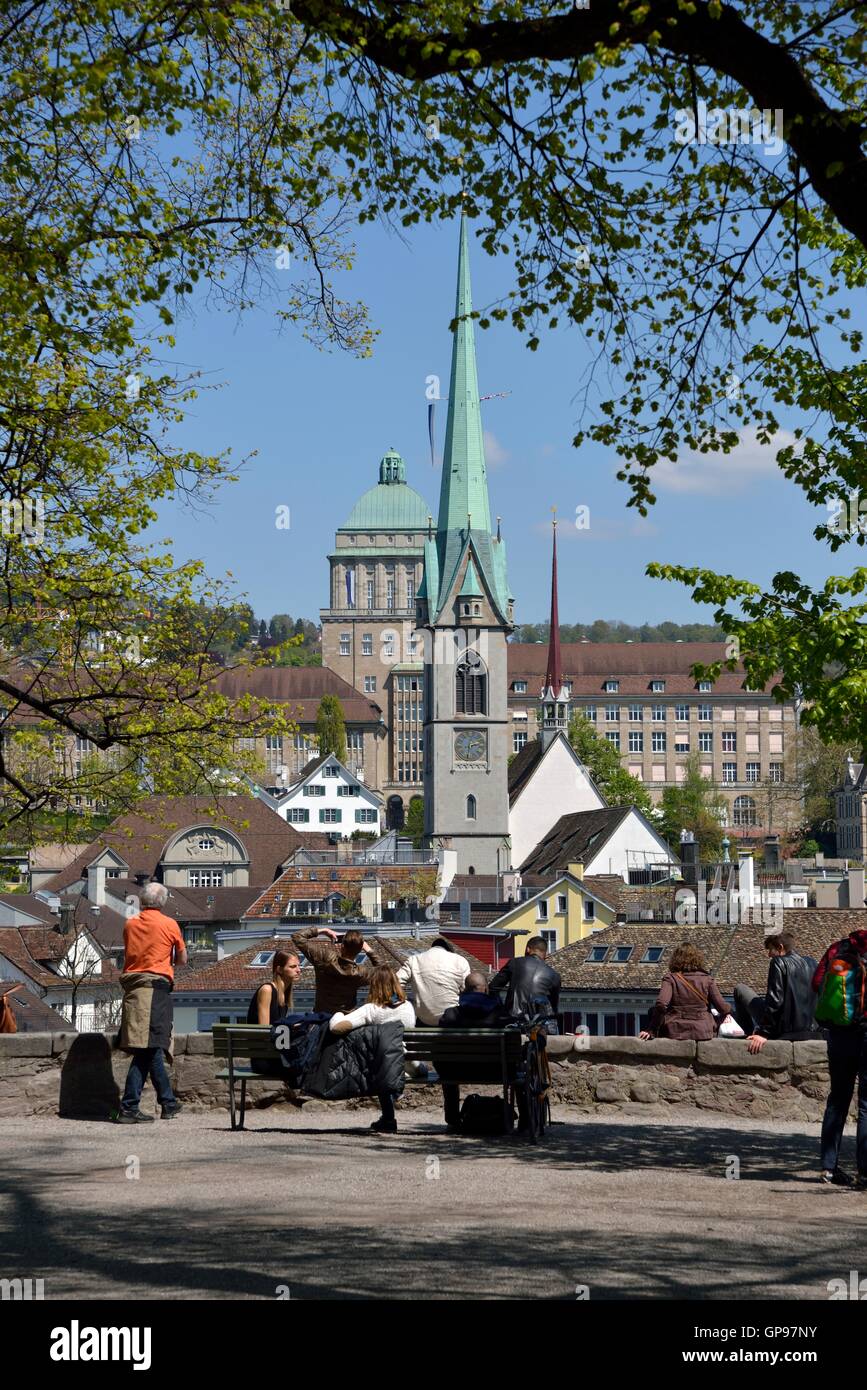 La Gente Sul Lindenhof Il Centro Storico Di Zurigo Universita E Predigerkirche In Background Zurich Svizzera Foto Stock Alamy