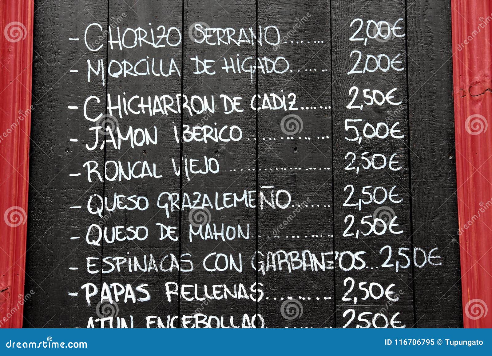 Immagini Stock Cartello Bianco Scritto A Mano Spagnolo Bianco In Parete Con Menu Tipici Piatti Di Cibo In Spagna Ristorante Come Panini Image