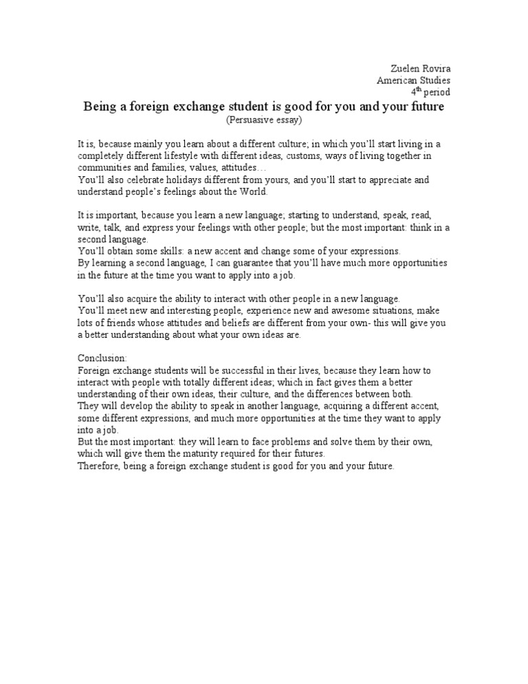 Essay evaluation doesn't have to be tedious Teach students the writing traits you're looking for by implementing a system that takes the responsibility from you and puts it on the students, while at the same time preventing hand and wrist cramps. I need a 4 page persuasive essay written on the topic WHY YOU SHOULD LEARN A FOREIGN LANGUAGE As a part of each argument in support of learning a foreign language, I need to argue in support of my position and also state the opposite opinion of each argument and refute it The essay needs to include Introduction clearly define the direction headed for essay topic, make it interesting in a way that the reader is hooked and interested in topic 1. A communication skill is some type of skill used in communication, From talking, body language to even listening Many things can effect the way one can convey his or her communication skills to others All of these skills are very personnel to one another Essay Sauce is the free student essay website for college and university students.
