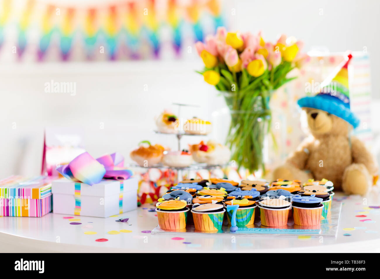 Cupcakes For Kids Birthday Celebration Jungle Animals Theme Children Party Decorated Room For Boy Or Girl Kid Birthday Table Setting With Presents Stock Photo Alamy