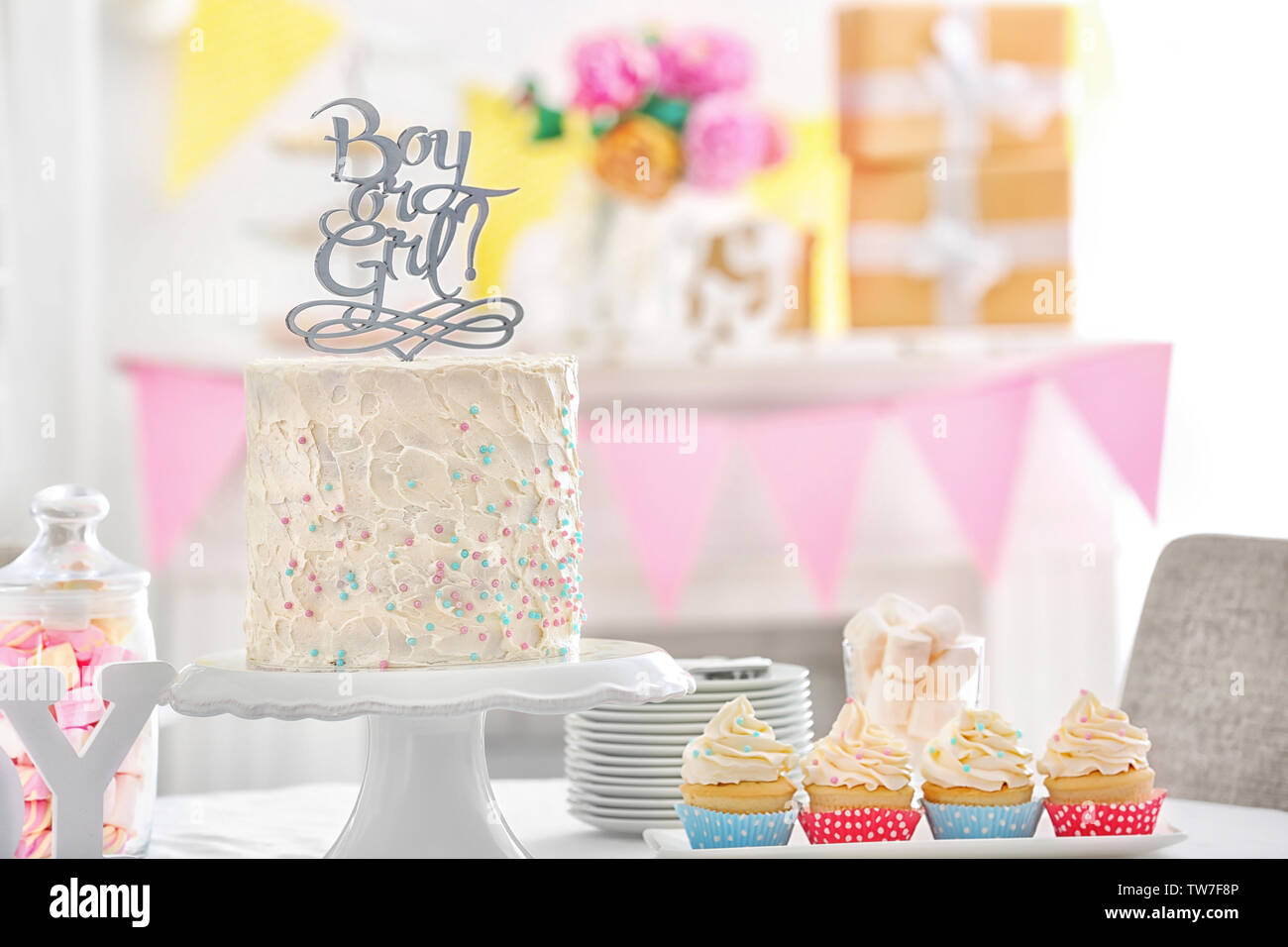 Boy Or Girl Cake And Cupcakes For Baby Shower Party On Table Indoors Stock Photo Alamy