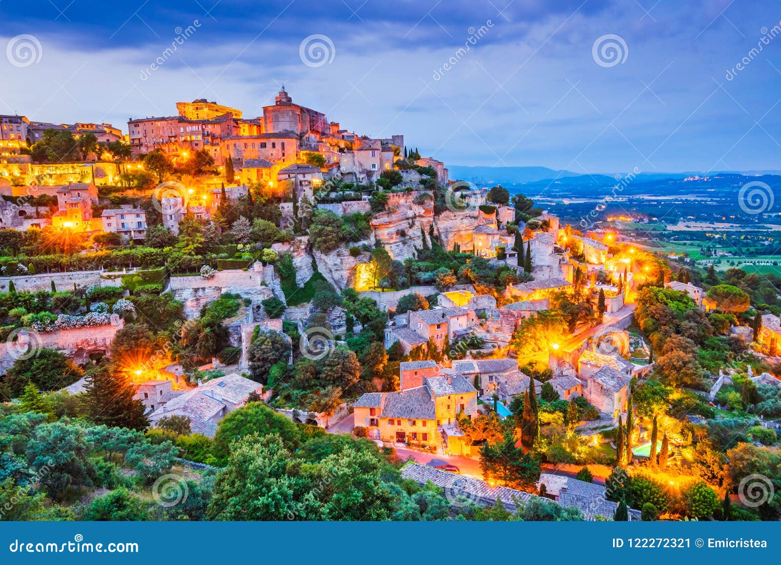 Gordes Provenza Francia Vista Panoramica De La Fantastica Noche En La Pintoresca Ciudad Medieval Gordes En La Region De Provencealpescote D Azur Comuna De Vaucluse Parque Nacional De Luberon Foto De Stock