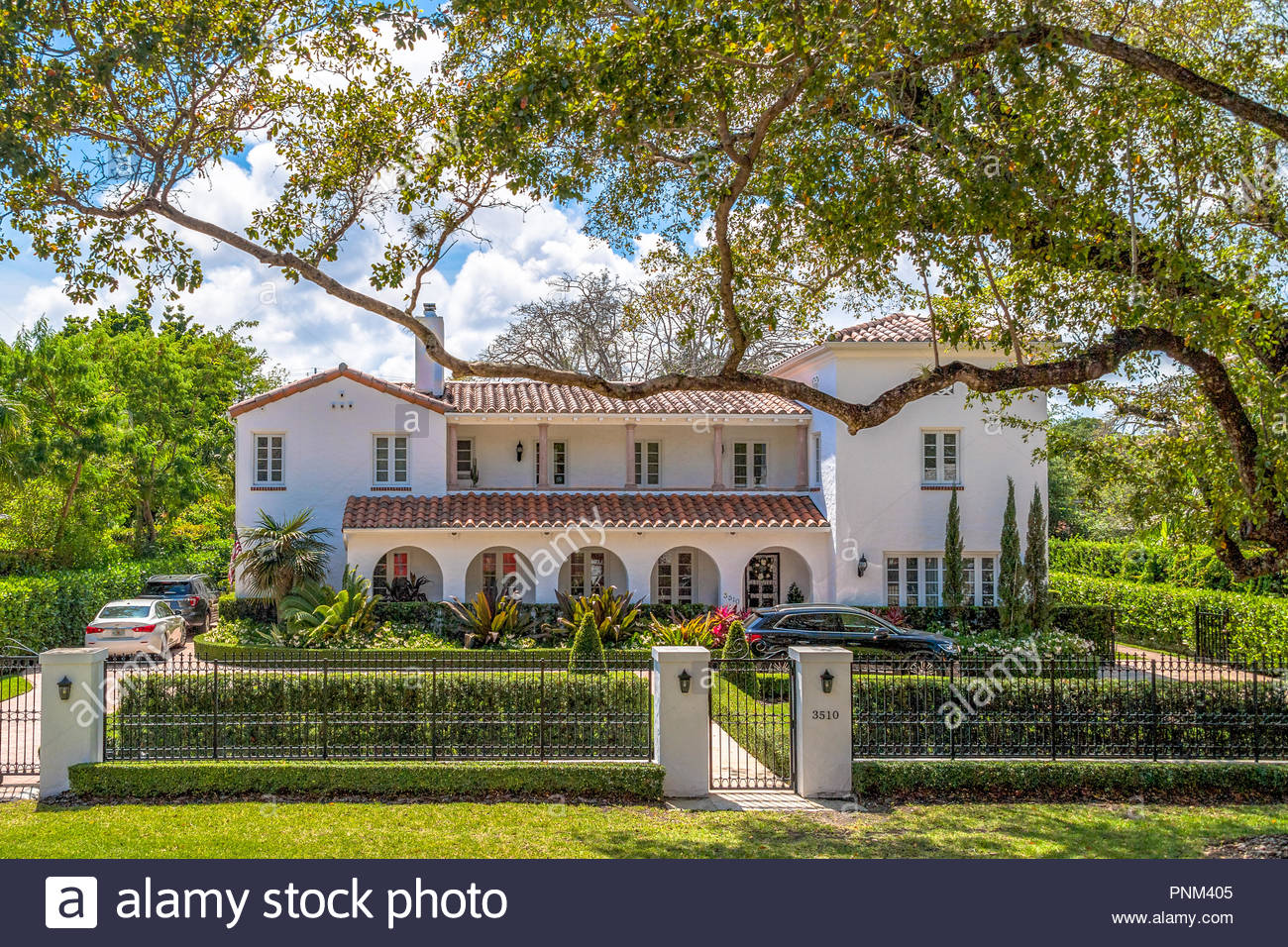 Luxurious Coral Gables Houses Florida Usa Facade Of A White Two Story House With Slant Roofs And Well Maintained Front Lawn Stock Photo Alamy