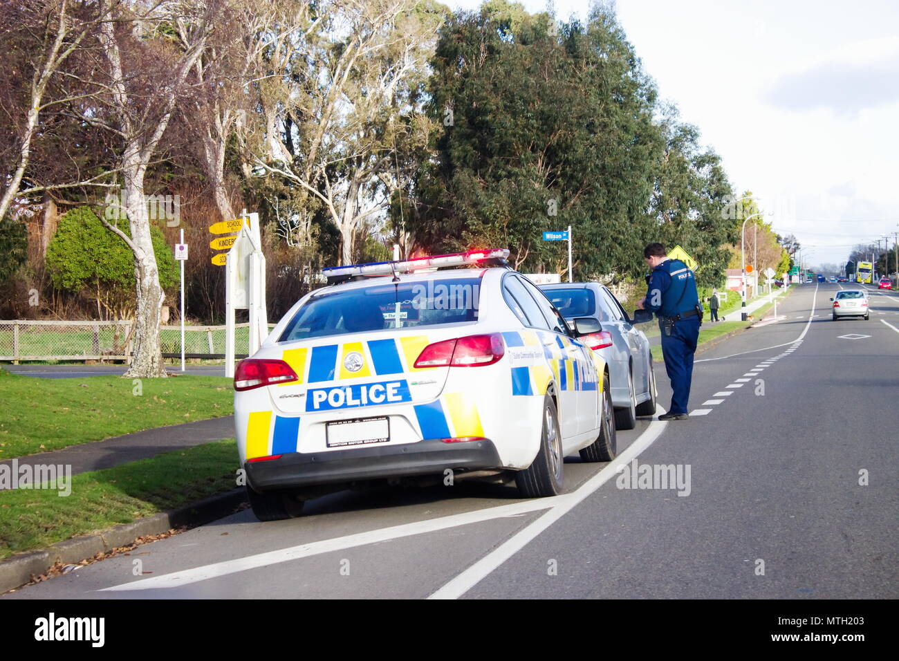 Bulls New Zealand 2 July 16 A Police Officer Pulls Over A Speeding Driver On The Main Road Of Bulls In New Zealand Stock Photo Alamy