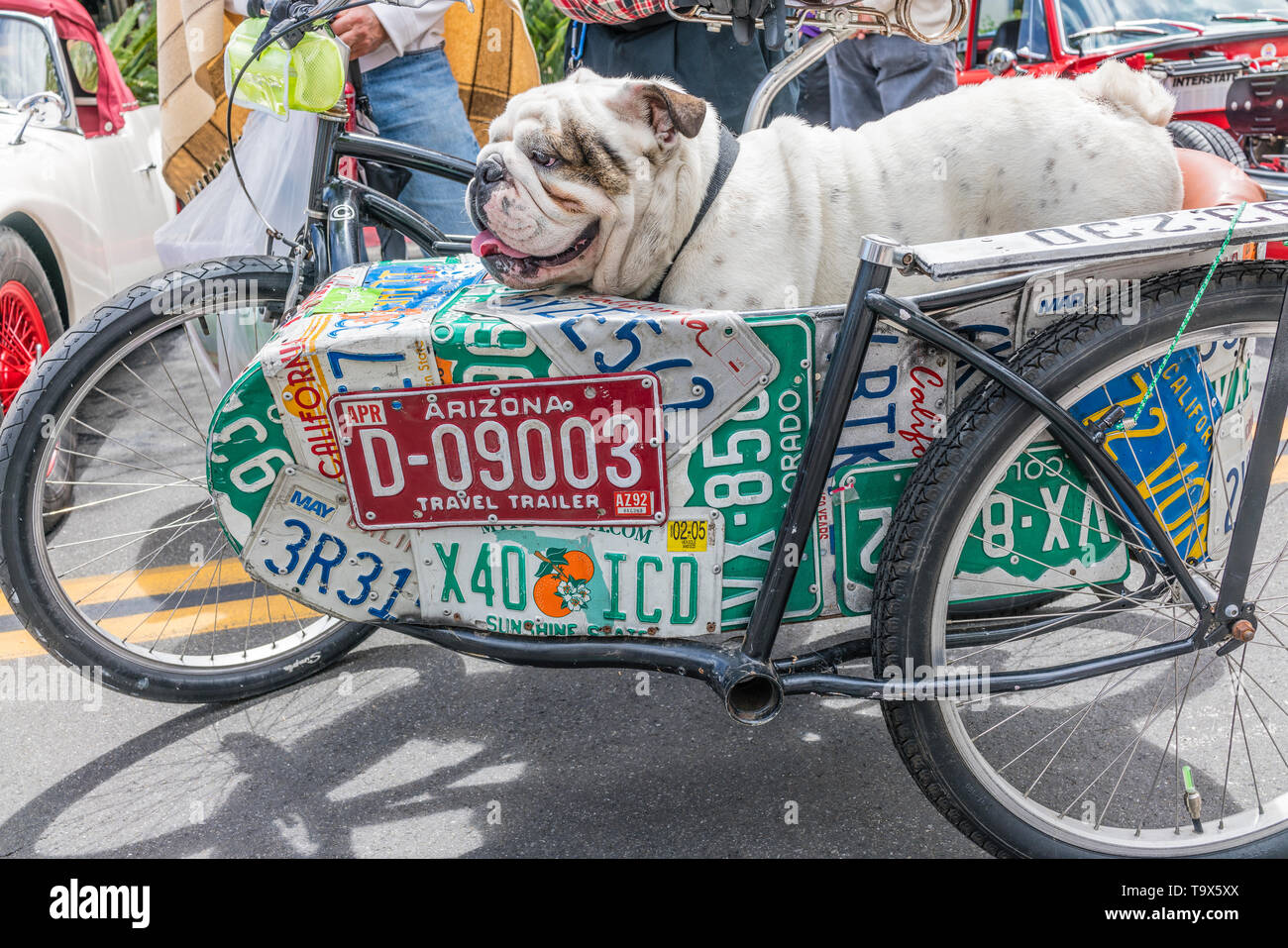 Un Britannico Bulldog Inglese In Un Sidecar Di Bicicletta Che Ha Il Lato Del Sidecar Coperto Con Lastre Di Licenza Da Un Certo Numero Di Stati Usa Allo Stato S Foto Stock