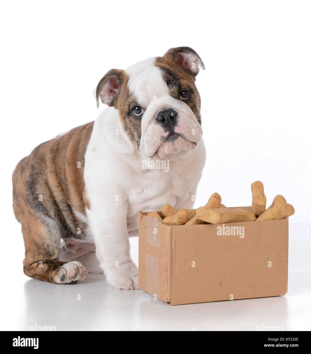 Bulldog Cucciolo Con Una Scatola Di Cartone Piena Di Ossa Foto Stock Alamy