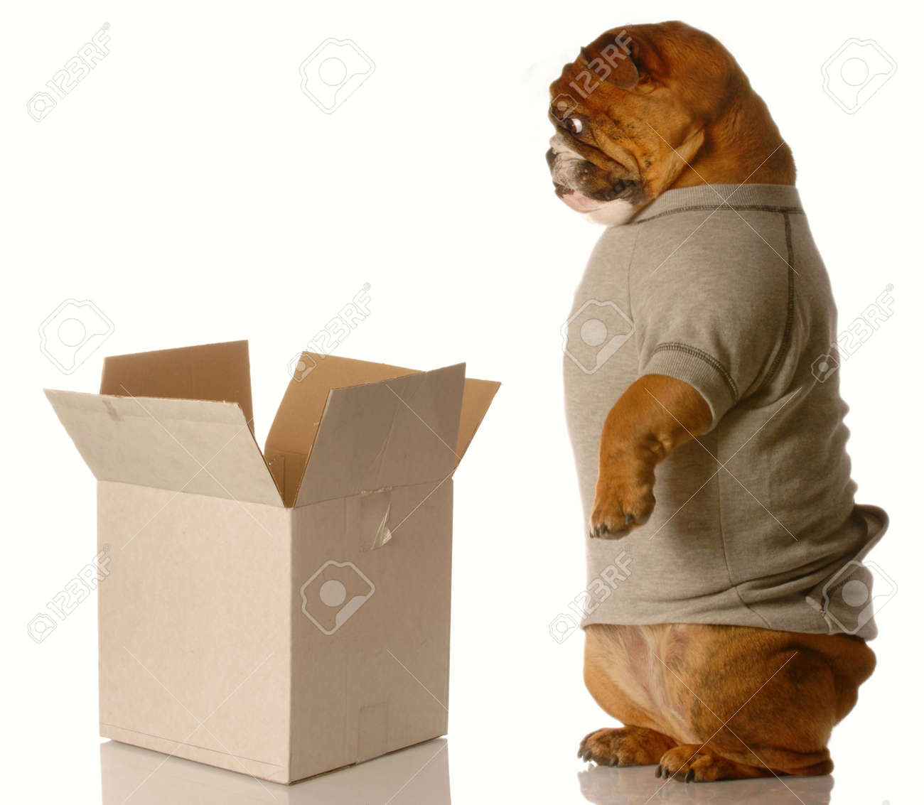 Immagini Stock Bulldog Inglese In Piedi Guardando Giu In Scatola Di Cartone Spedizione O Lo Spostamento Di Concetto Image