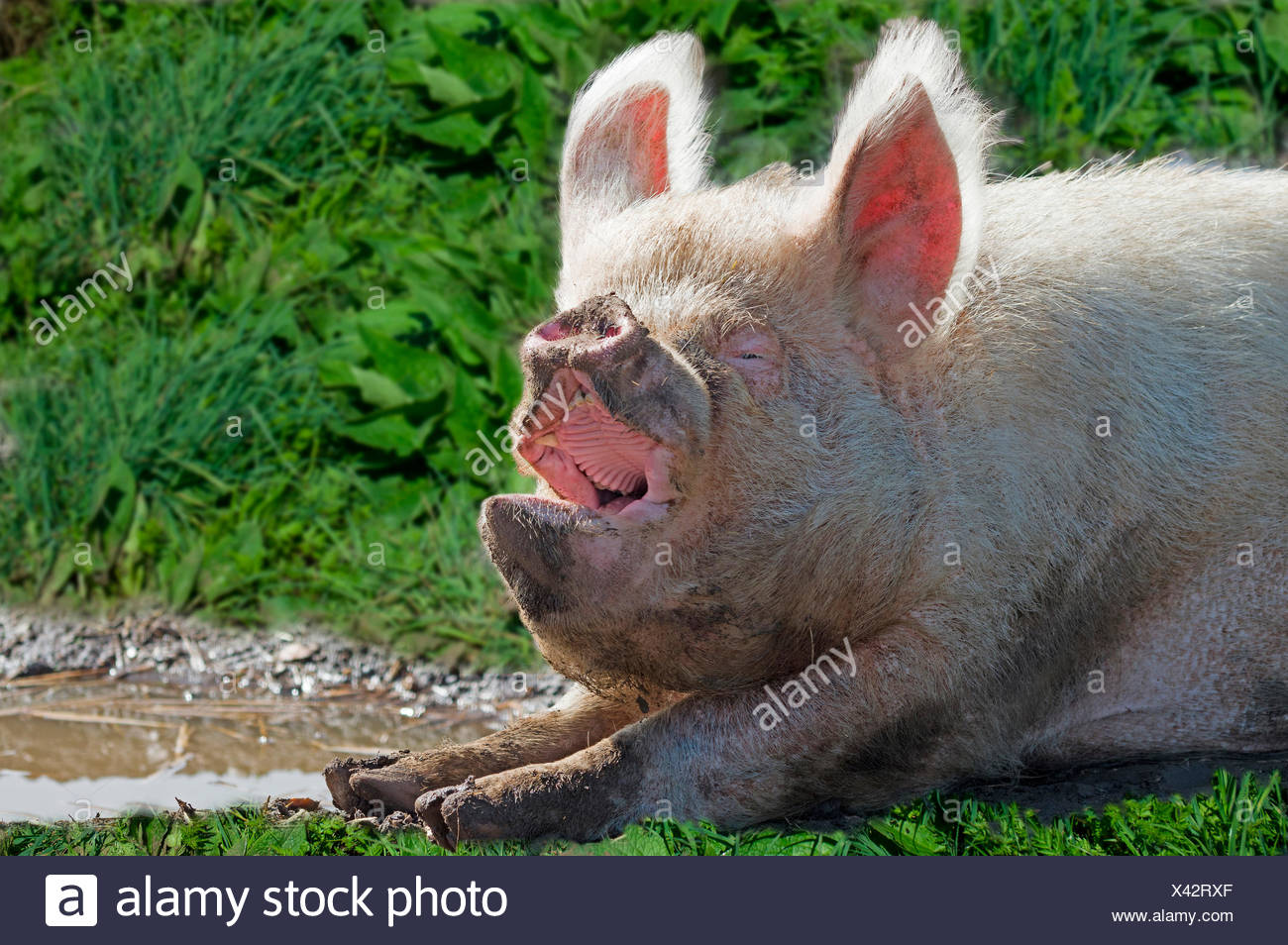 Suini Domestici Inglese Medio Di Maiale Bianco Giacente Su Un Prato Mentre Sbadigli Inghilterra Foto Stock Alamy