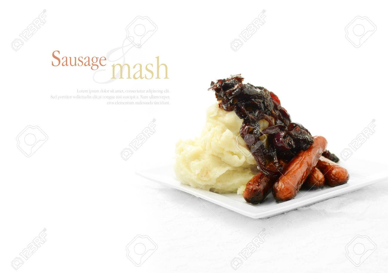 Immagini Stock Tradizionale Roba Inglese Salsicce Di Maiale Alla Griglia Con Pure Di Patate Cremose Condite Con Cipolle Rosse Caramellate In Camicia In Vino Rosso Copia Spazio Esteso Image
