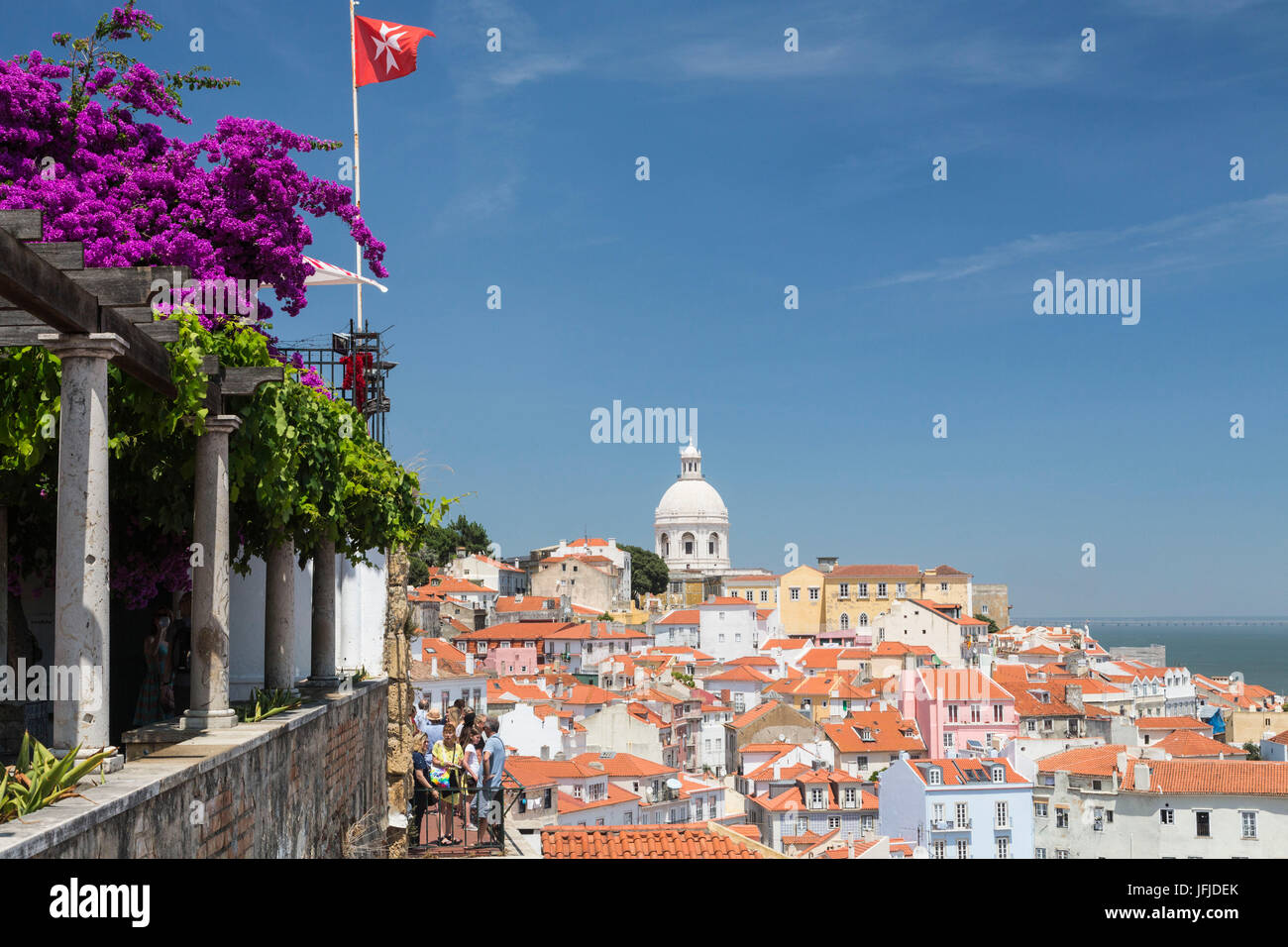 Fiori Su Un Telaio Terrazza Sui Tetti Di Terracotta E L Antico Duomo A Miradouro Alfama Punto Di Vista Di Lisbona Portogallo Europa Foto Stock Alamy