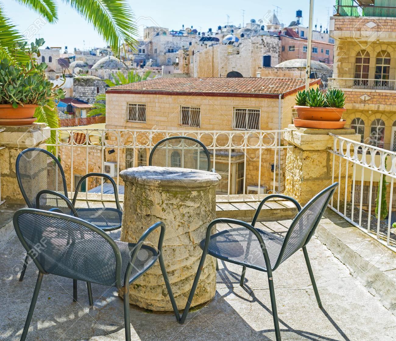 Immagini Stock La Terrazza Sulla Strada Con Vista Sui Tetti Della Citta E Il Posto Migliore Per Rilassarsi All Ombra Gerusalemme Israele Image
