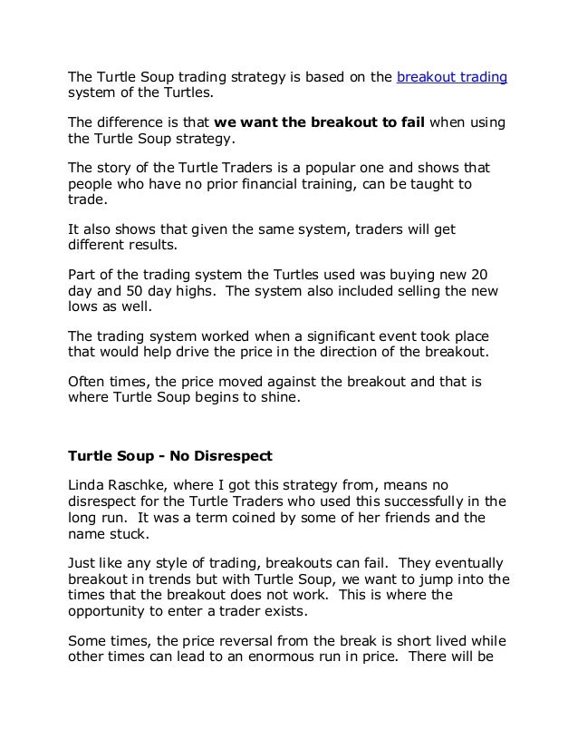 Convinced that one could learn to be a good trader, he hired thirteen students and taught them his "Turtle Trading System", in 19 He funded each student with funds, from $500K to $2M, starting in Feb, 1984 They were called his "turtles" Over the next four years the turtles averaged an annual return of 80%. The Turtle Soup trading strategy delivers what its author, Linda BradfordRaschke, set out to create a strategy based on a trendfollowing approach but which only trades on false breakouts (ie when it appears the trend has changed) and shortterm reversals These are the movements the strategy tries to benefit from. The Turtle Soup trading strategy was created by legendary trader and Market Wizard Linda BradfordRaschke This is an inverse strategy to the legendary Turtle traders trend following system that they used to make millions in trending markets.