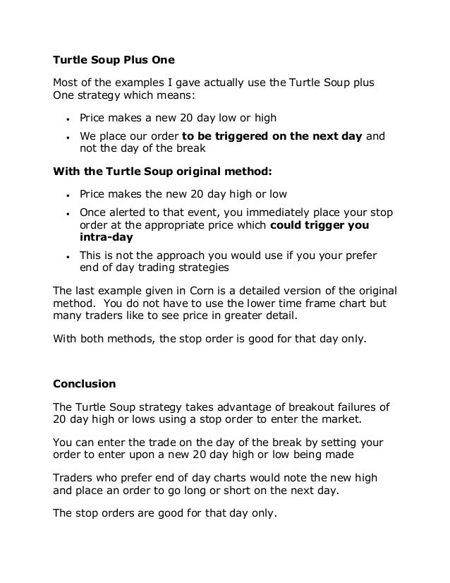 (While supplies last!) Access to two exclusive BONUS Episodes of The No Homework Zone each month!. 3 Four trading days later the market is 12 points lower 1 New highs (caused by record earnings) I79 ^78 7/3 7/5 7/10 7/17 7/24 8/1 8/3 8/7 8/9 8/14 8/21 8/28 DavJ 3 A 14point gain in nine days The Turtle Soup and Turtle Soup Plus One strategies work in all time frames Here are two examples using 10minute bars. The Turtle Soup pattern is a volatile price action pattern that is more suitable for swing trading Our team at Trading Strategy Guides is working hard to put together the most comprehensive PDF guide to different cryptocurrency strategies.