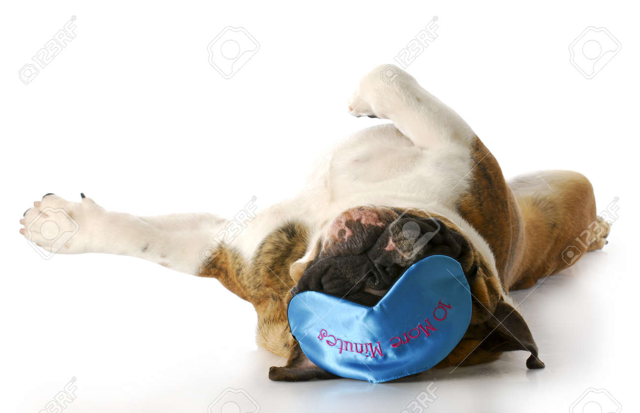 Immagini Stock Bulldog Inglese Posare Indietro Con Maschera Di Sonno Che Dice Dieci Minuti Piu Con La Riflessione Su Sfondo Bianco Image