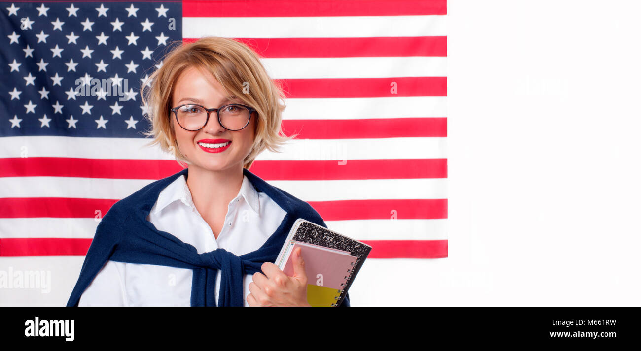 Sorridente Ragazza Su Stati Uniti Bandiera Dello Sfondo Studente E Di Apprendimento Della Lingua Inglese Come Lingua Straniera Bandiera Americana Foto Stock Alamy